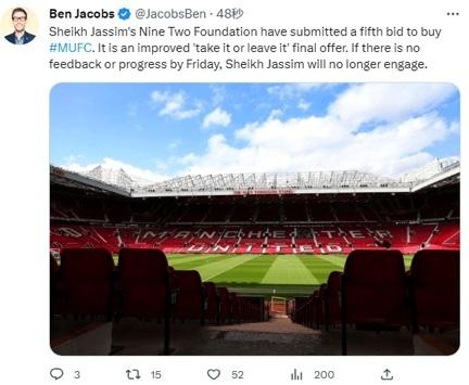 来源:JRS直播网06-08 17:19JRS直播网06月08日晚,来自美国哥伦比亚广播公司体育记者Ben Jacobs的独家报道。卡塔尔人谢赫-贾西姆为曼联开出了第五份,也是最后一份报价,该报价为65亿美元。如果到周五曼联方面依然没有反馈或进展,他将不再参与此事。值得注意的是,65亿美元(52亿英镑)距离格雷泽对曼联60亿英镑的估值,依旧有很大差距。