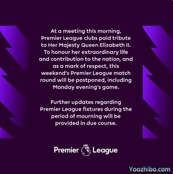 英超官宣本周末比赛全部延期:作为对女王的尊重,下轮比赛也或推迟