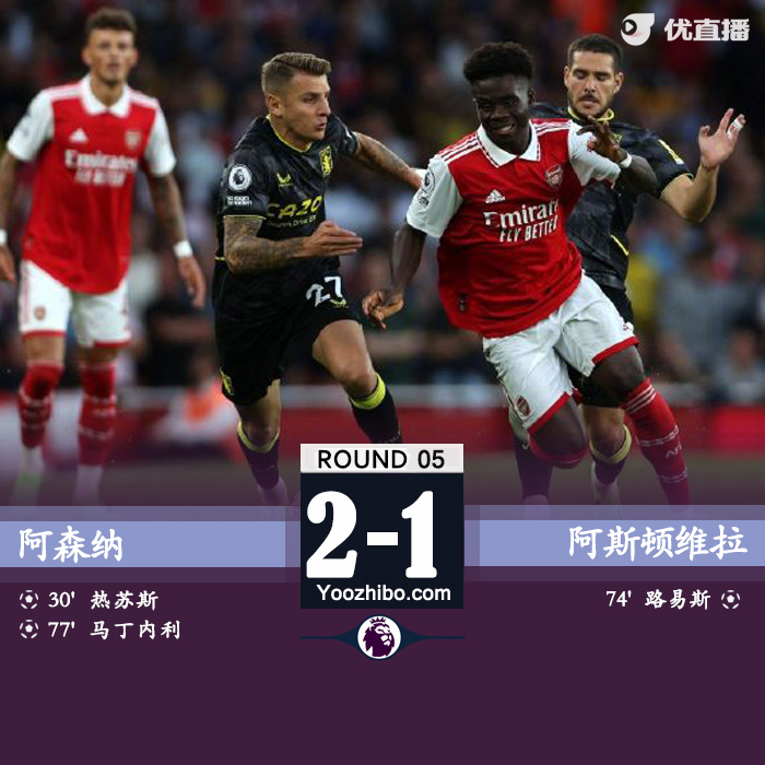 来源:JRS直播网09-01 10:09 JRS直播网讯:北京时间9月1日2点30分,英超第5轮一场焦点战在酋长球场进行,由领头羊阿森纳坐阵主场对战来访的阿斯顿维拉,本场比赛的主裁是罗伯特·琼斯。上半场节奏很快,开场维拉率先在反击中制造威胁,布恩迪亚禁区中路射门高出。随后阿森纳连续发动猛攻,热苏斯和加布里埃尔先后威胁维拉大门,萨卡面对空门离谱踢飞。终于热苏斯在一次进攻中补射破门打破僵局。下半场厄德高任意球被扑出,路易斯角球直接破门扳平比分。随后萨卡助攻马丁内利迅速反超。最终阿森纳2-1战胜阿斯顿维拉,新赛季开局取得五连胜,继续领跑英超。