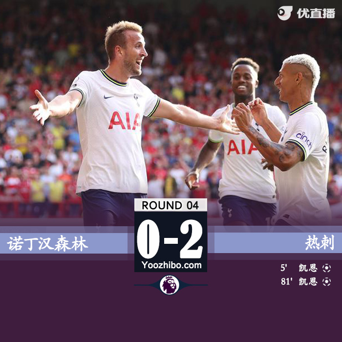 第80分钟,理查利森外围左侧外脚背传中,凯恩后点面对空门轻松将球顶进,热刺2-0诺丁汉森林。