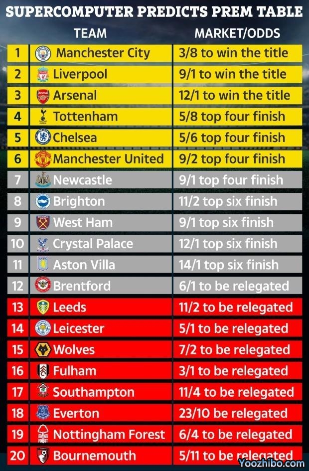 JRS直播网08月24日讯 据《太阳报》报道,超级计算机预测本赛季英超冠军将由曼城获得,利物浦、阿森纳和热刺则分别排名2-4位。