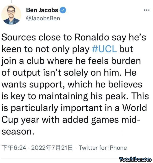 C罗希望自己的新东家不仅能获得参加欧冠联赛的机会,还需要是一家他觉得自己不需要承担全部责任的俱乐部。葡萄牙巨星希望自己能得到支持,他认为这是自己保持巅峰状态的关键。这在世界杯年尤其重要,因为赛季中期会有更多比赛。