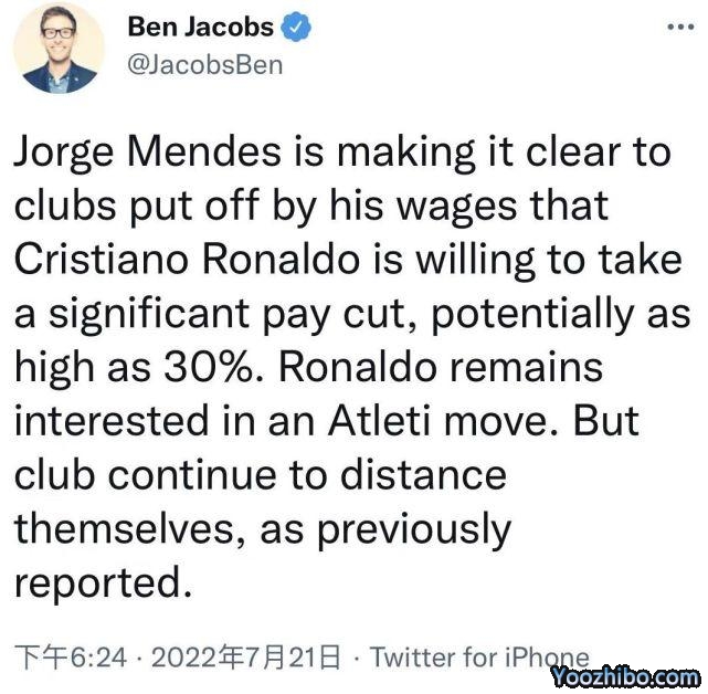 在提出要求的同时,C罗也通过经纪人门德斯,向那些被高薪劝退的俱乐部明确表示,自己愿意接受大幅减薪,可能高达30%。目前,C罗在曼联的周薪大概为48-50万英镑。也就是说,新东家只要能提高35万英镑的周薪,便能满足C罗的要求。