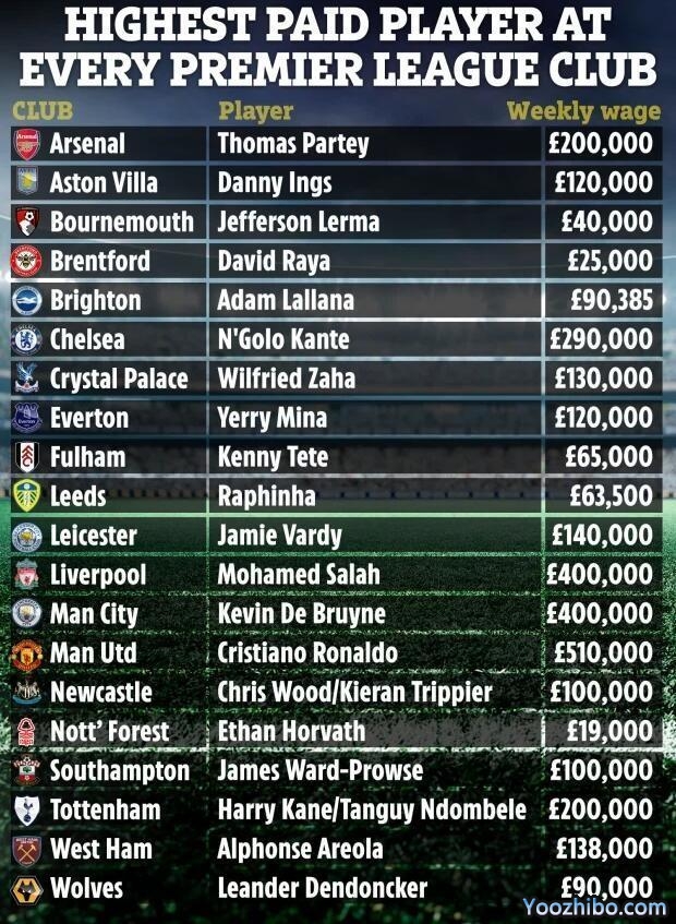 来源:JRS直播网07-04 12:25JRS直播网07月04日讯 《太阳报》援引Sportrac数据,统计了英超各队薪水最高的球员。