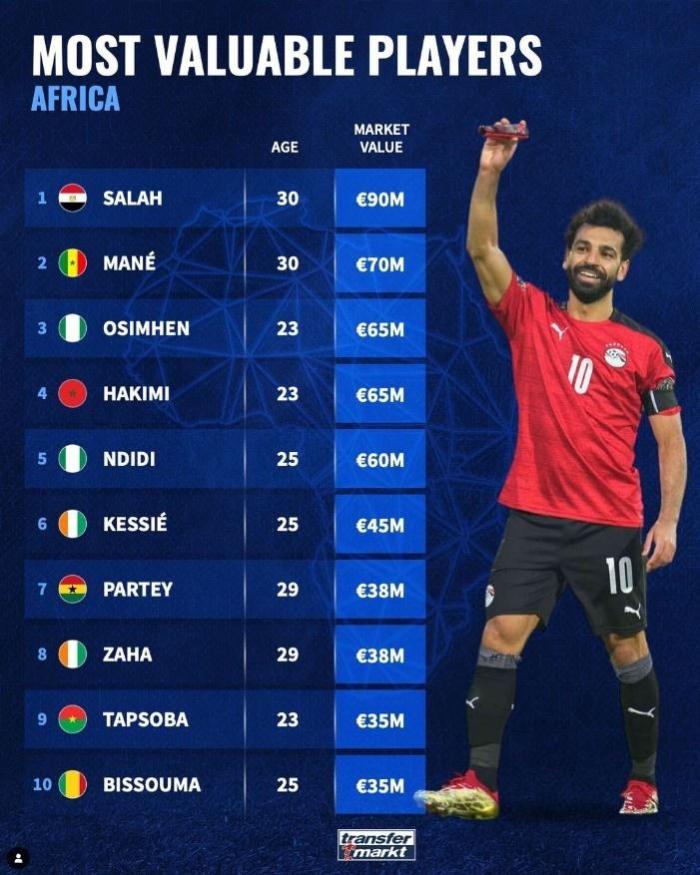 萨拉赫凭借9000万欧元力压刚刚转会加盟拜仁的前队友马内,那不勒斯的尼日利亚前锋奥斯梅恩则排名第三,具体如下: