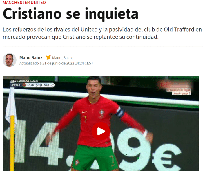 马德里的《阿斯报》称,他们从C罗的经纪人豪尔赫·门德斯处得到消息,称葡萄牙巨星对曼联的引援进展感到苦恼,担心竞争对手都已经先行一步。C罗已经决意留在曼联履行第二年合同,但转会的状况让他产生了怀疑。该报足球记者马努·赛恩斯(Manu Sainz)称:「C罗希望曼联增强实力,但到目前为止,俱乐部对阵容调整的决心似乎并没有想象中那么大。」