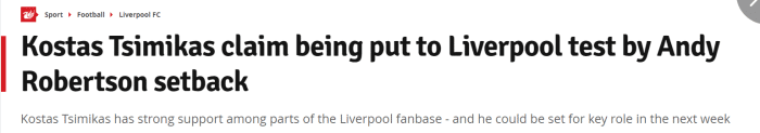罗伯逊在苏格兰对阵丹麦的世预赛中因为腿筋不适被换下,尽管他的伤势不重,但是利物浦主教练克洛普并不想冒险,苏格兰人将在对阵阿森纳的比赛中轮休。