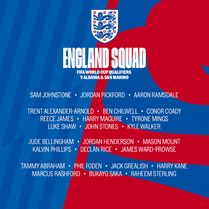 英格兰最新一期大名单: