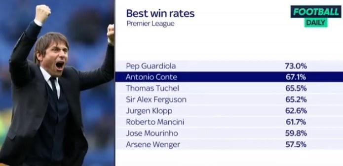 JRS直播网11月03日讯 热刺昨晚官宣孔蒂成为球队新帅,据FootballDaily统计,这位意大利教头在英超的胜率排名历史第二。