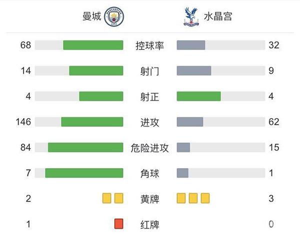 最终全场比赛结束,水晶宫2-0战胜曼城!