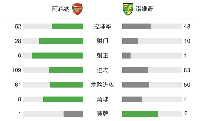 第66分钟,萨卡禁区弧顶将球分到右路,佩佩左脚兜射击中立柱后弹到门前,奥巴梅扬乱战中将球打进,阿森纳1-0诺维奇。