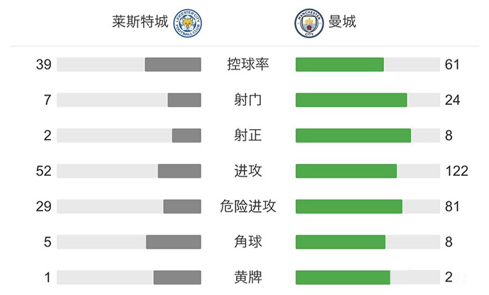 第61分钟,格拉利什回敲给坎塞洛,坎塞洛直接打门被瑟云聚封堵,随后贝尔纳多-席尔瓦补射得手,曼城1-0莱斯特城。