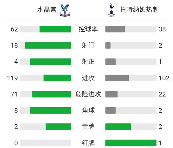 热刺0-3水晶宫 坦甘加染红扎哈传射