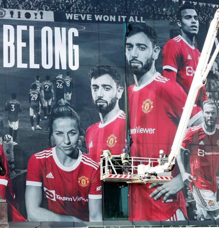 在这幅巨大的海报上,原本最大的两名球员,是新援桑乔和球队核心费尔南德斯,两人一左一右拱卫着梦剧场正门。