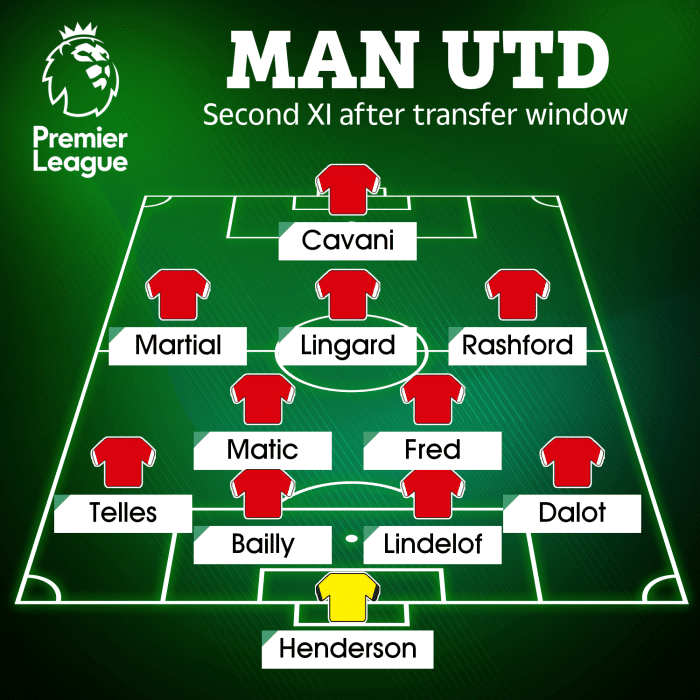 曼联替补阵容:迪恩·亨德森/迪奥古·达洛,林德勒夫,埃里克·巴伊,特莱斯/弗雷德,马蒂奇/拉什福德,林加德,马夏尔/卡瓦尼。
