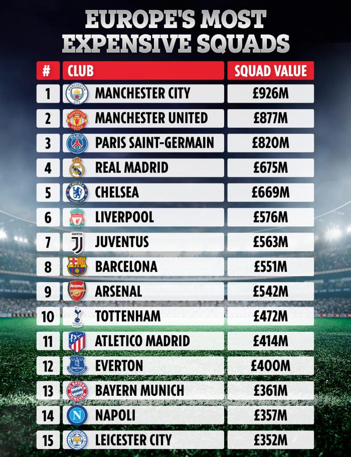 而据瑞士「CIES足球瞭望台」公布的数据,曼联眼下的阵容花费的转会费,在欧洲足坛排名第二,总值8.77亿英镑,仅次于曼城的9.26亿英镑。今夏引援动作巨大的巴黎圣日耳曼,由于采用了免费转会手法,目前阵容价值8.2亿英镑,排名第三。