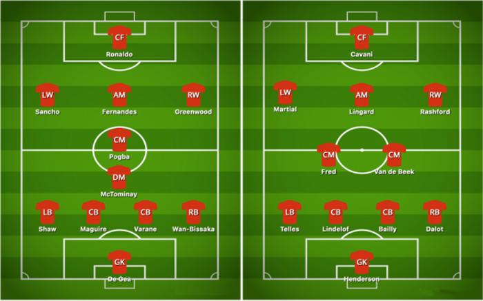 曼联第一国脚阵容:德赫亚/迪奥古·达洛,瓦拉内,马奎尔,卢克·肖/麦克托米内,博格巴/梅森·格林伍德,布鲁诺·费尔南德斯,桑乔/C罗;