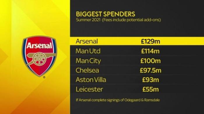 JRS直播网讯 由于阿森纳即将签下厄德高和拉姆斯代尔,因此,有媒体统计,如果加上这两笔交易的转会费,阿森纳今夏的转会支出将达到1.29亿英镑,位列英超球队第一。