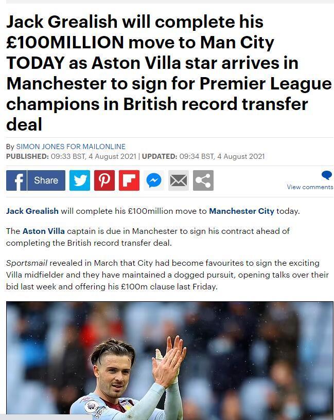 来源:JRS直播网08-05 10:40JRS直播网讯 今日,据英媒《每日邮报》消息,阿斯顿维拉队长格拉利什今天将与曼城签约,转会费1亿英镑。