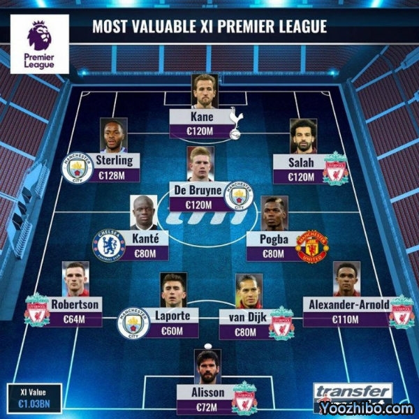 盘点目前英超身价最贵11人阵容:总和超10亿!