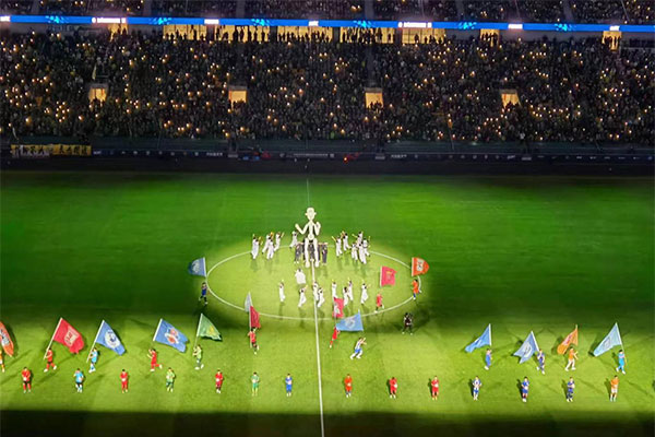 随后,北京国安队功勋教练金志扬与现役球员张玉宁一起,手推划线车,亲手绘制出 2023新赛季揭幕战赛场的中场线。 当两人行至球场中圈时,启幕影片中的6名球迷代表(老中青少一家人) 手捧光球来到球场中央,将他们对足球的热爱与信念共同注入到划线车中。伴随着划线车继续前进,环场一周的能量光球不停闪烁,代表着球迷们心中的希望之光,仿佛无限能量不断地汇聚。最终整个绿茵场被依次点亮,观众席6万名球迷也随之点亮自己手中的希望之光,呼唤着2023新的赛季、新的开端的到来。