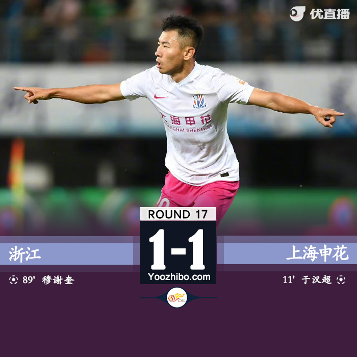 JRS直播网9月10日讯 北京时间9月10日19:30,中超第17轮,浙江队迎战上海申花。上半场,吴曦助攻于汉超先下一城,浙江队屡失良机!下半场,曹赟定送点,穆谢奎主罚命中扳平比分!全场比赛结束,浙江队1-1上海申花!