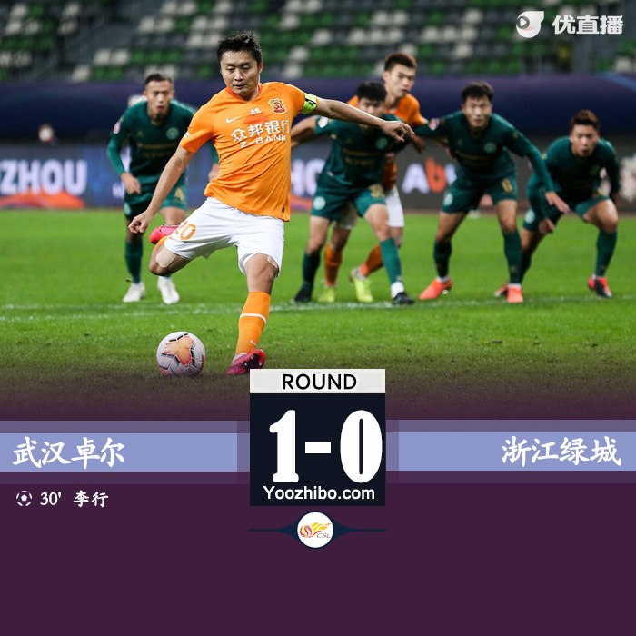 JRS直播网讯:北京时间11月22日晚间19:35,2020赛季中超升降级附加赛次回合,武汉卓尔对阵浙江能源绿城。上半场比赛龙成失误送点,李行点射率先破门。下半场双方都没有进球,最终卓尔1-0小胜绿城,总比分3-2战胜绿城保留中超资格。