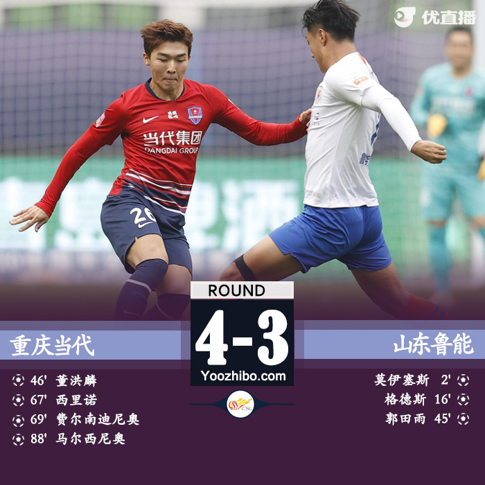 JRS直播网讯:11月6日下午,2020赛季中超联赛第二阶段5-6名决赛首回合比赛展开争夺,山东鲁能在3球领先情况下,被重庆当代连进4球逆转,最终山东鲁能3-4落败。第3分钟,刘彬彬边路传中,莫伊塞斯抢射破门。第17分钟,郭田雨送次妙传,格德斯推射空门得手。46分钟,莫伊塞斯助攻,郭田雨停球凌空抽射得分。第47分钟,郑铮防守出现失误,董洪麟推射空门得手。第69分钟,马尔西尼奥头球被挡,费尔南迪尼奥补射破门。第89分钟,西里诺送出直塞,马尔西尼奥单刀破门。