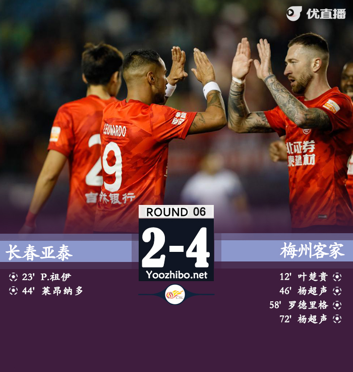 全场比赛结束,长春亚泰2-4梅州客家。本场过后,长春亚泰以3胜1平2负的战绩积10分,排名第5。梅州客家2胜2平2负积8分,升至第7位。