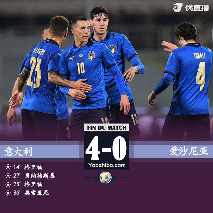 全场比赛结束,意大利4-0爱沙尼亚。