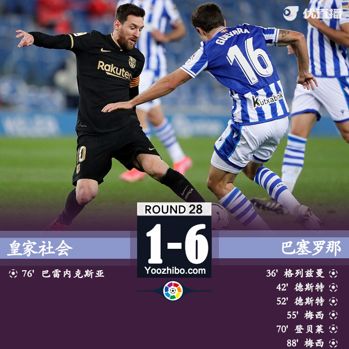 JRS直播网3月22日讯 北京时间3月22日星期一04:00,西甲第28轮皇家社会主场迎战巴塞罗那。上半场,格列兹曼首开记录,梅西助攻德斯特扩大比分。下半场,德斯特破门完成双响,梅西梅开二度,登贝莱建功,巴雷内切亚扳回一城。最终,巴萨6-1皇家社会迎5连胜,积分榜升至联赛第二位。