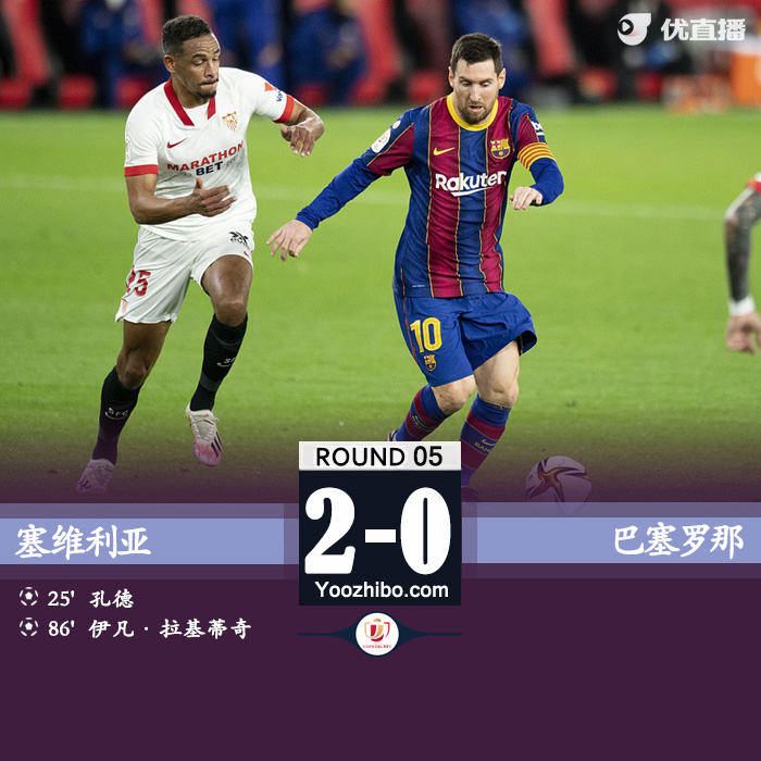 JRS直播网2月11日讯 北京时间2月11日凌晨4点整,2020-21赛季西班牙国王杯半决赛首回合在皮斯胡安球场展开角逐,巴塞罗那客场挑战塞维利亚。上半场梅西单刀被挡,孔德一条龙首开纪录,下半场拉基蒂奇弑旧主。最终巴塞罗那客场0-2不敌塞维利亚,双方将于3月4日移师诺坎普球场进行次回合较量。
