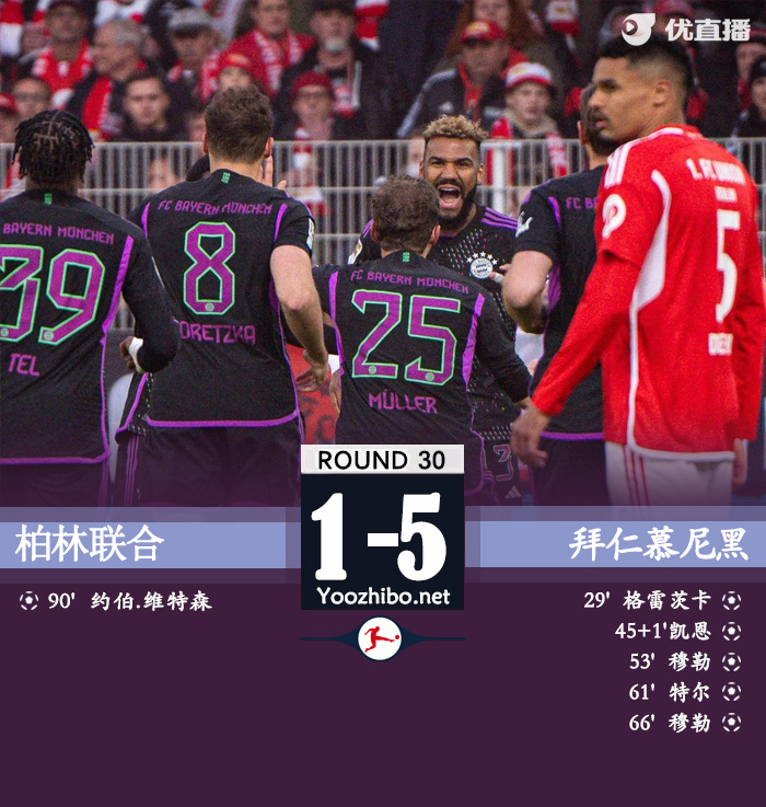 JRS直播网讯:北京时间4月21日0:30,德甲联赛第30轮,拜仁慕尼黑客场挑战柏林联合,上半场格雷茨卡禁区抽射破门,凯恩任意球扩大比分。下半场穆勒后点垫射破门,凯恩助攻特尔得分,穆勒头球梅开二度,费尔特森抽射扳回一球,最终拜仁5-1大胜柏林联合。