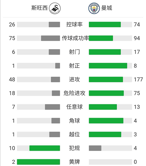 全场比赛结束,最终,曼城3-1斯旺西!