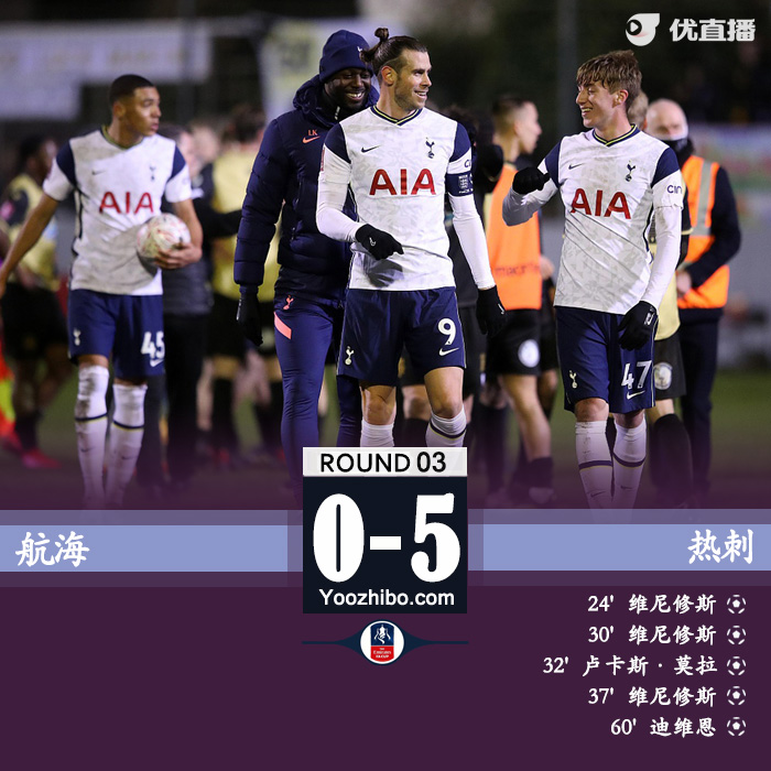来源:JRS直播网01-11 14:39 JRS直播网讯:北京时间1月11日1:00,英格兰足总杯第3轮,热刺客场挑战航海。上半场,维尼修斯连下两城,小卢卡斯任意球破门,维尼修斯再入一球完成帽子戏法。下半场,16岁小将迪瓦恩抽射近角破门。全场比赛结束,热刺5-0大胜航海,晋级下一轮。