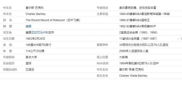 查尔斯·巴克利(Charles Barkley),1963年2月20日出生于美国亚拉巴马州利兹市,前美国职业篮球运动员,1992年巴塞罗那奥运会、1996年亚特兰大奥运会“梦之队”成员,司职大前锋,绰号”空中飞猪“(The Round Mound of Rebound)。个人简介: