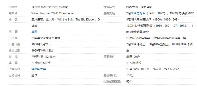 威尔特·张伯伦(Wilt Chamberlain,1936年8月21日-1999年10月12日),出生于美国宾夕法尼亚州费城,前美国职业篮球运动员,司职中锋。个人简介: