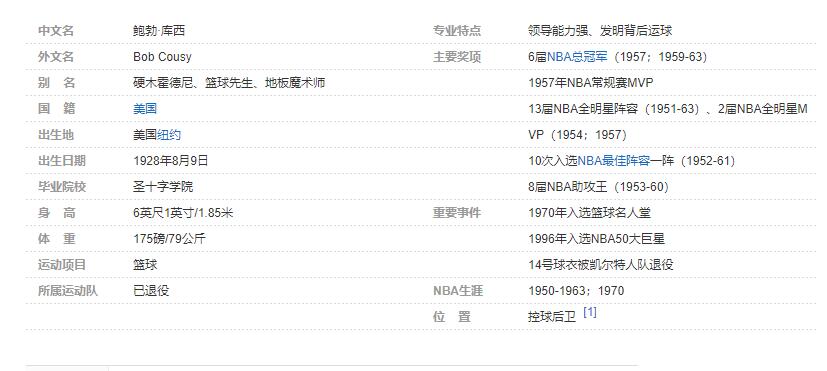 鲍勃·库西(Bob Cousy),1928年8月9日出生于美国纽约,前美国职业篮球运动员,司职控球后卫,发扬了背后运球,被誉为是控球后卫的鼻祖。个人简介: